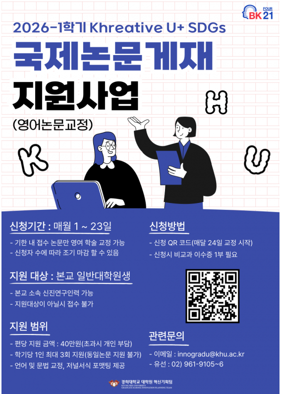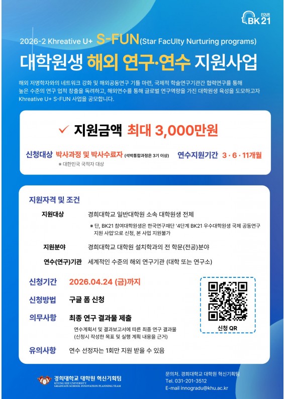 [대학원혁신기획팀] 2026-2기 Khreative U+ S-FUN (대학원생 해외연구·연수 지원사업) 신청안내