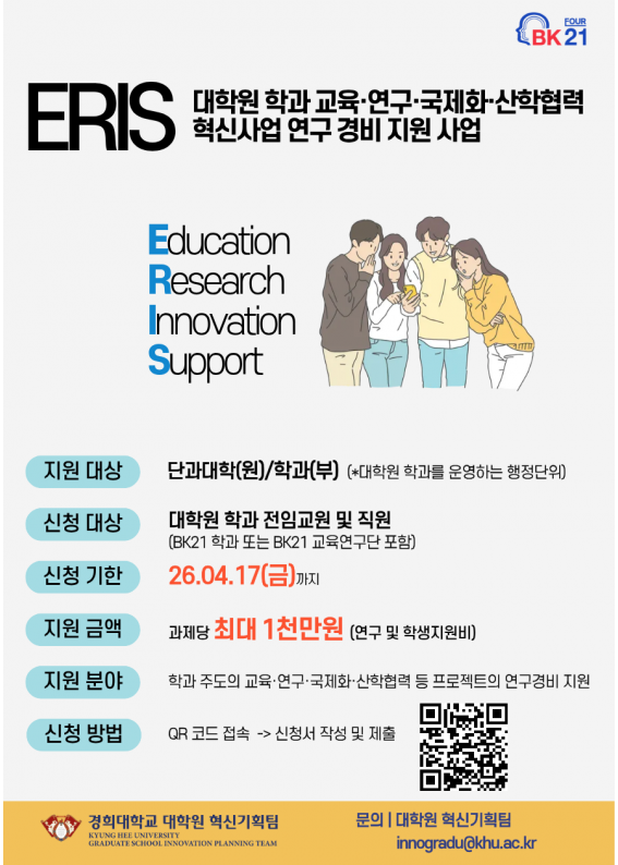 [대학원혁신] 2026-1차 ERIS 사업 신청 안내 (대학원 학과 교육,연구,국제화,산학협력 혁신사업 연구 경비 지원 사업) ~4/17(금)