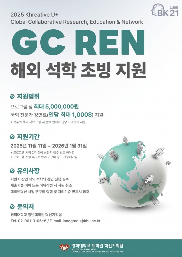 대학원혁신기획팀에서 2025 Khreative U+ GC REN : 해외 석학 초빙 지원 사업을 실시합니다.
