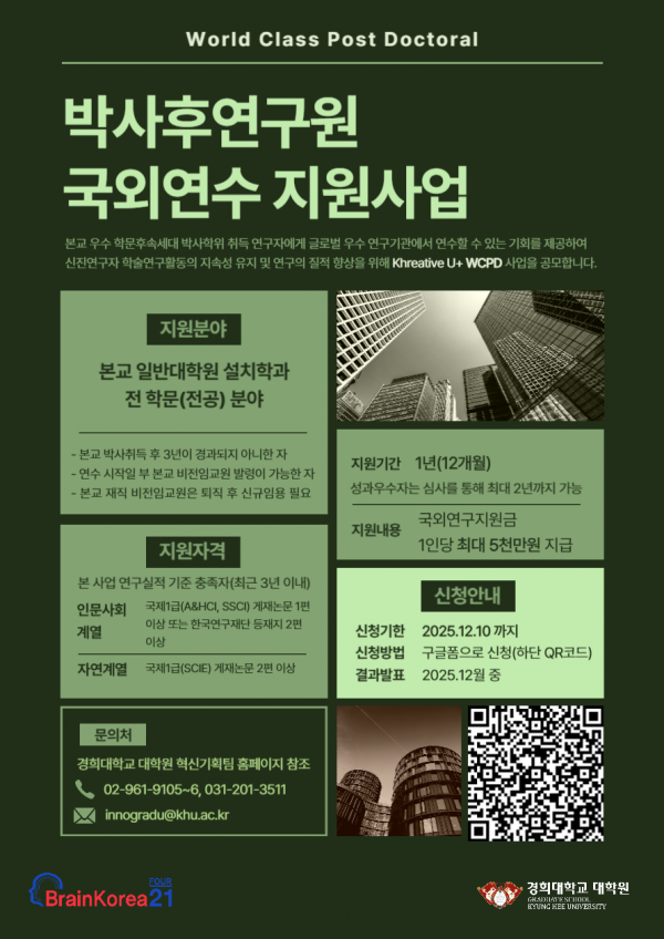 [대학원혁신] 2026학년도 Khreative U+ WCPD 박사후연구원 국외연수 지원사업 신청 안내(~12/10)