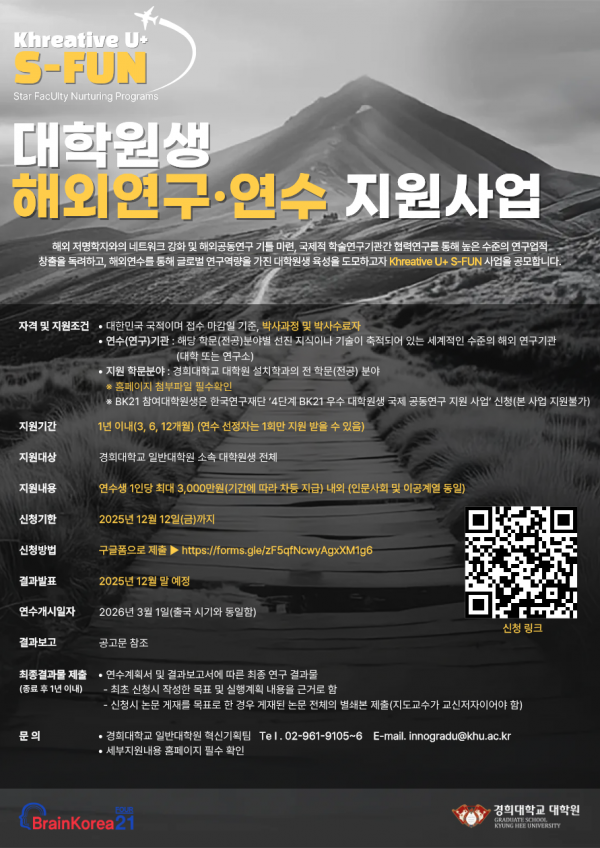 [대학원혁신] 2026학년도 Khreative U+ S-FUN Programs(대학원생 해외연구·연수 지원) 사업 신청 안내(…