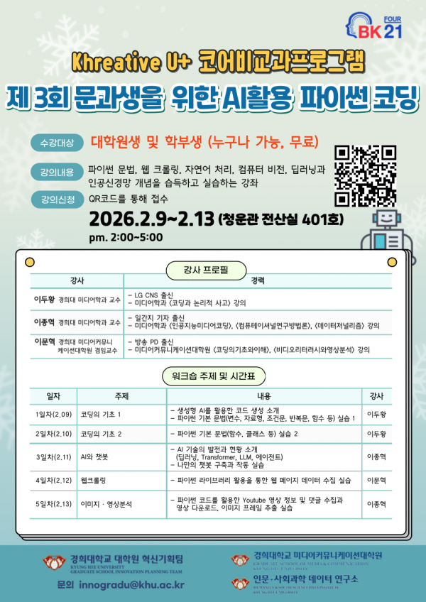 - 이전글Khreative U+ 대학원생 연구역량 강화 웨비나 26.02.05