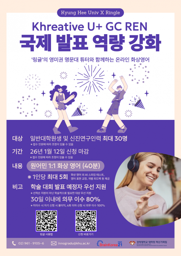 대학원혁신기획팀에서 2025 Khreative U+ GC REN : 국제 발표 역량 강화 사업을 실시합니다.