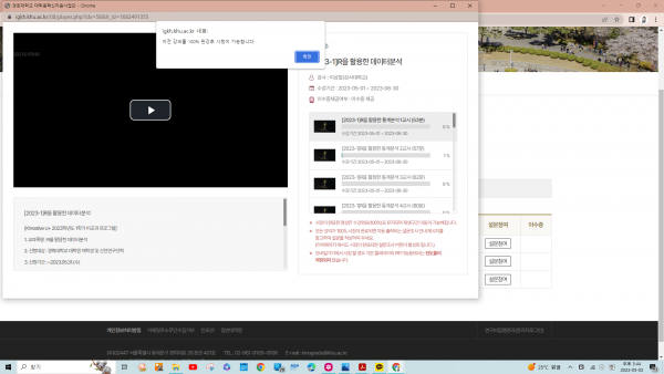 r 강의 오류 페이지 정보 작성자 김은아 댓글 1건 조회 571회 작성일 23-05-03 15:45 본문 스크린샷 첨부합니다 아직 재생 안됩니다 1강 강의 입니다. 목록 이전글Re: [2023-1]SPSS를 활용한 데이터분석 강사 : 신우영 2강 23.05.08 다음글Re: r 강의 오류 23.05.08 댓글목록 댓글목록 김은아님의 댓글 김은아 작성일 23-05-04 18:47 1강 들었는데 2강 재생시 동일 오류 발생합니다 1강 들었는데 2강 재생시 동일 오류 발생합니다